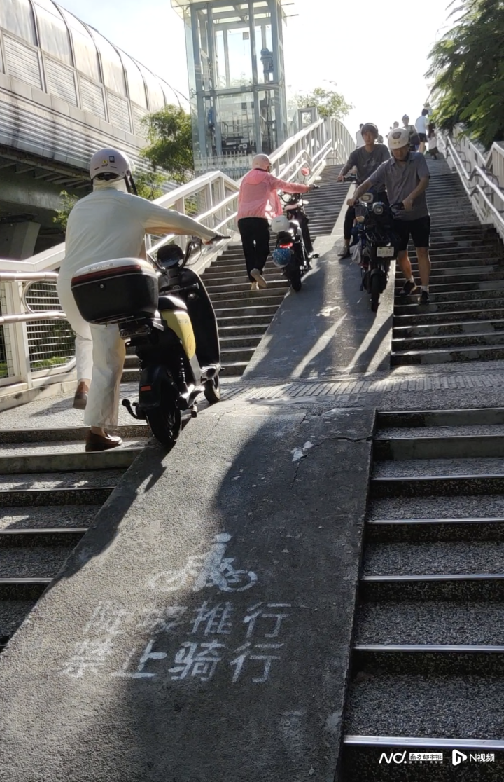 深圳市交通运输局南山管理局经现场调研后表示,鉴于客观情况,天桥整体拓宽可行性较低。目前坡道宽度已从2022年接收时的0.55米拓宽至1.15米,“这一宽度符合双向推行的国家标准,能满足市民的正常推行需求。”若进一步拓宽坡道,将压缩台阶区域行人空间,行人可能被迫走入坡道,反而加剧骑行与步行混行风险。