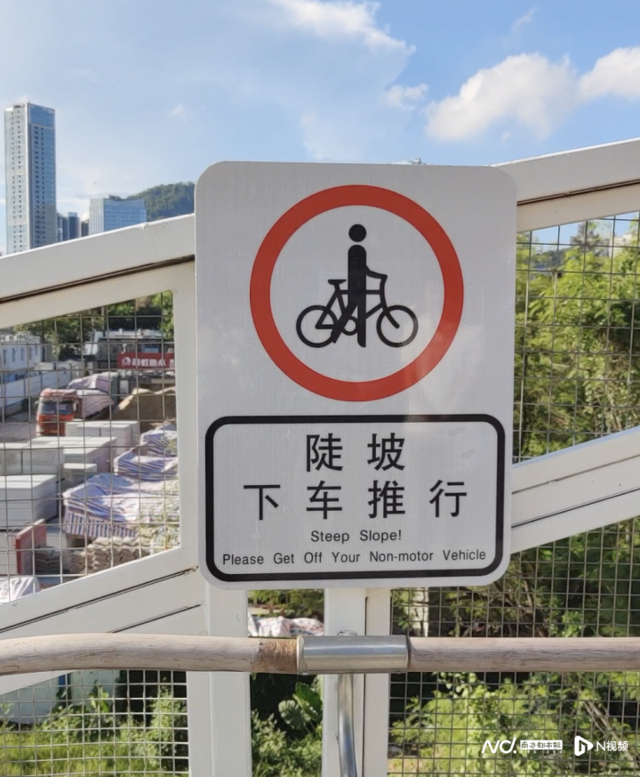 奥一新闻记者从市交通运输局南山管理局获悉,9月14日上午10时左右,已启动滨海大道跨平南铁路人行天桥提示标识增设施工。9月15日上学高峰时段,奥一新闻记者回访现场看到,天桥两端已有义工、社区工作者驻守站岗维护交通秩序;桥面有警力执勤,喇叭循环播放“戴好头盔”“上下请推行”的提示音。值得一提的是,桥面坡道及扶手两侧,“陡坡推行、禁止骑行”的醒目标识也已增设完毕。