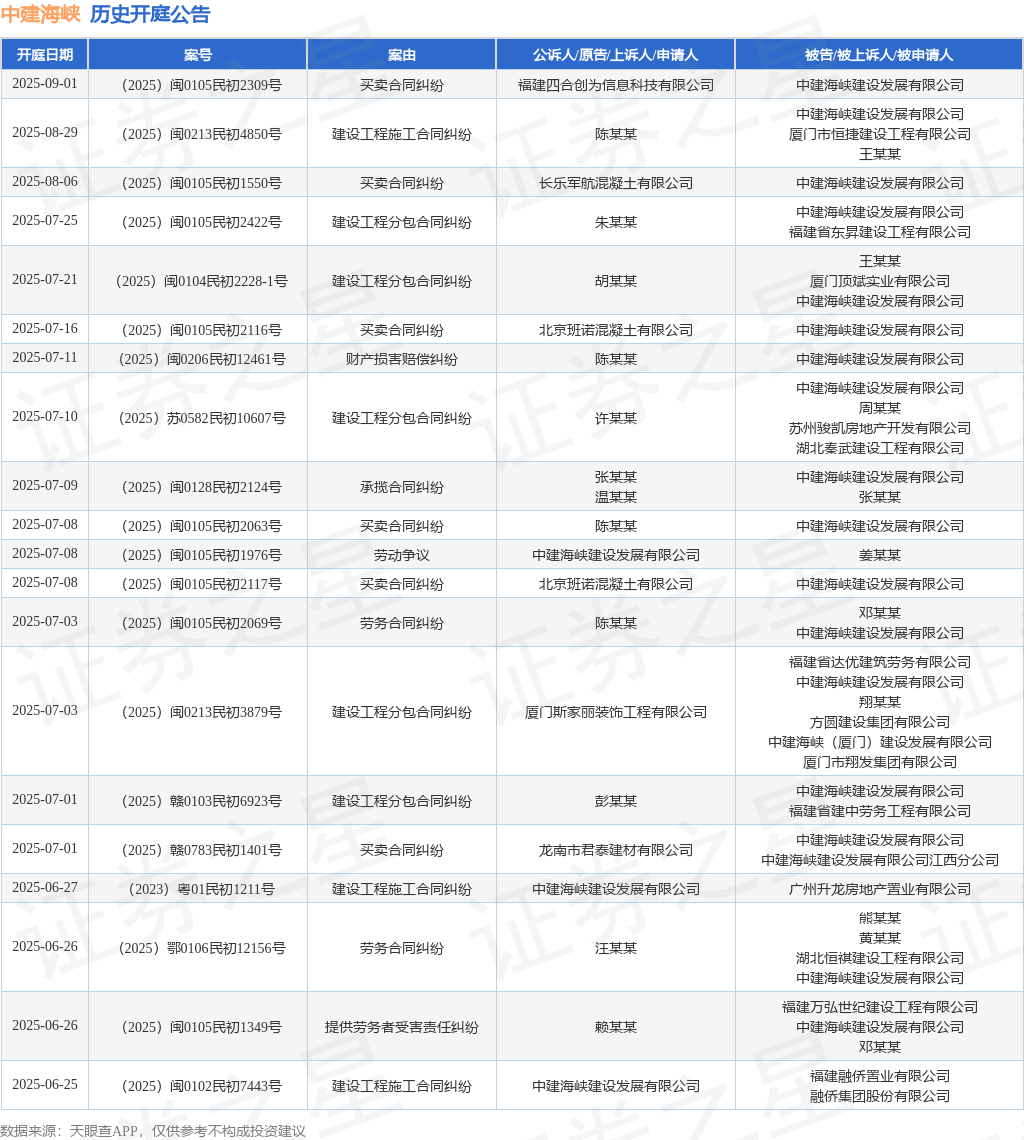 案号:(2023)粤01民初1211号审理法院:广东省广州市中级人民法院案由:建设工程施工合同纠纷当事人信息: 原告/上诉人:中建海峡建设发展有限公司 被告/被上诉人:广州升龙房地产置业有限公司开庭日期:2025年6月27日根据统计,近一年内以中建海峡建设发展有限公司为当事人的历史开庭公告有435则,其中案由为“建设工程施工合同纠纷”的公告以129则居首,其次为“买卖合同纠纷”有59则,“建设工程分包合同纠纷”有50则。历史开庭公告(前20条)如下: