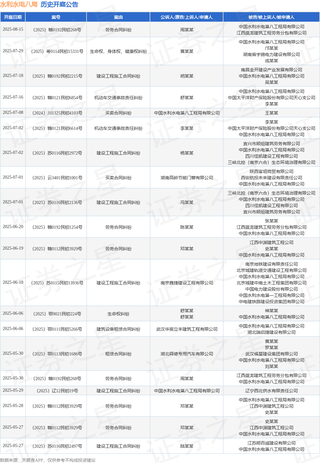 案号:(2025)赣0112民初3929号审理法院:南昌市新建区人民法院案由:劳务合同纠纷当事人信息: 原告/上诉人:邓某某 被告/被上诉人:江西中渊建筑工程公司、史某某、中国水利水电第八工程局有限公司开庭日期:2025年6月19日根据统计,近一年内以中国水利水电第八工程局有限公司为当事人的历史开庭公告有117则,其中案由为“建设工程施工合同纠纷”的公告以28则居首,其次为“劳务合同纠纷”有22则,“建设工程分包合同纠纷”有11则。历史开庭公告(前20条)如下: