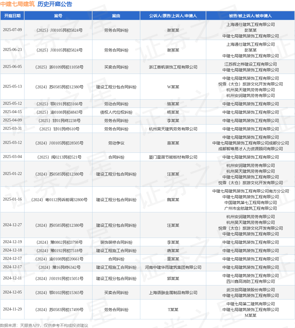 案号:(2025)川0105民初5824号审理法院:成都市青羊区人民法院案由:劳务合同纠纷当事人信息: 原告/上诉人:谢某某 被告/被上诉人:上海通仕建筑工程有限公司、彭某某、中建七局建筑装饰工程有限公司开庭日期:2025年6月23日根据统计,近一年内以中建七局建筑装饰工程有限公司为当事人的历史开庭公告有36则,其中案由为“建设工程分包合同纠纷”的公告以11则居首,其次为“劳务合同纠纷”有6则,“买卖合同纠纷”有5则。历史开庭公告(前20条)如下: