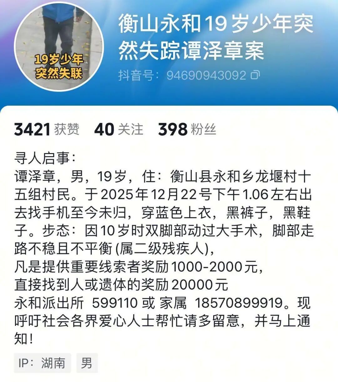 据寻人启事,2025年12月22日下午,衡阳市衡山县永和乡龙堰村,19岁的村民谭泽章出门寻找丢失的手机,至今未归。当天谭泽章身穿蓝色棉袄,黑色牛仔裤,黑色运动鞋。因10岁时做过大型手术,谭泽章走路时腿脚有点不平不稳。寻人启事上还写着:找到人或遗体的奖励2万元。